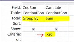 Sa revenim asupra interogarii in care calculam numarul total de produse vandut pe fiecare bon. Dorim sa gasim doar bonurile care conțin mai mult de 20 de produse, deci vom adauga aceasta condiție la Criteria:
