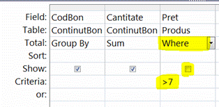 Pe linia Total, in dreptul coloanei Produs, alegem din lista derulanta Where. Astfel, specificam ca aceasta coloana este folosita pentru o comparație (filtrare) și deci nu va aparea in rezultate. Observați ca Access de-bifeaza automat Show din dreptul coloanei.