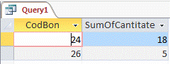 Alegeți Group By pentru CodBon și Sum pentru Cantitate. Rulați interogarea și observam rezultatul. In imaginea de mai jos am inclus și rezultatul anterior, in scop demonstrativ: