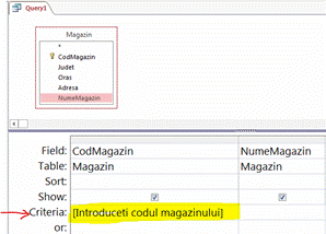 Odata salvate, interogarile trebuie editate pentru a schimba valorile crtieriilor. Un mod mult mai efeicient de a face interogarile mai flexibile este sa solicitam utilizatorului valoarea unui parametru la momentul cand se ruleaza interogarea. Pentru aceasta, introducem intre paranteze patrate textul care va fi afișat la momentul rularii. De exemplu, vrem sa aratam numele magazinului in funcție de un CodMagazin specificat de utilizator:
