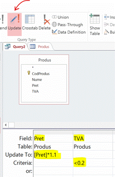 In urmatorul exemplu vom mari cu 10% prețurile tuturor produselor care au TVA-ul mai mici de 20%. Inainte de a rula interogarea, sa observam produsele al caror preț va fi modificat: