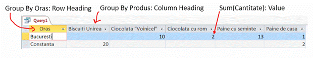 Rezultaul arata totalul cantitații vandute din fiecare produs, in fiecare oraș. Acum sa analizam modul in care am definit cele 3 elemente din interogare (antetul liniei, antetul coloanei și valorile din tabel):