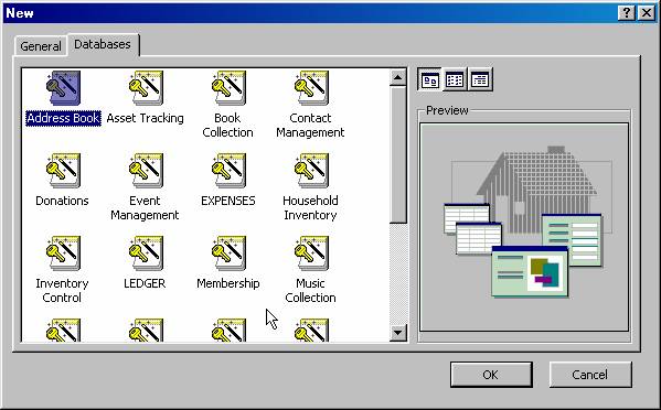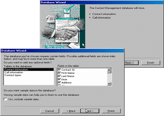Pentru a folosi aplicatia Database Wizard, alegeti optiunea corespunzatoare din caseta de dialog si executati clic pe butonul OK pentru a deschide caseta de dialog New. In partea superioara a casetei de dialog se afla etichetele General si Databases. Pagina Databases contine sabloane si fisiere, care contin structura elementara a unei baze de date. Selectati sablonul Contact Management si executati clic pe butonul OK. Noua caseta de dialog File New Database va invita sa introduceti un nume de fisier in campul File name si o locatie pentru baza de date dupa care executi clic pe butonul Create. Se va deschide caseta de dialog Database Wizard, in care, executand clic pe butonul Next (Urmatorul), veti putea selecta campurile de care aveti nevoie in structura bazei de date, veti putea selecta un stil de afisare, veti putea alege un stil de raport si veti putea introduce un titlu al bazei de date.