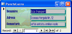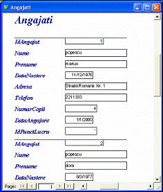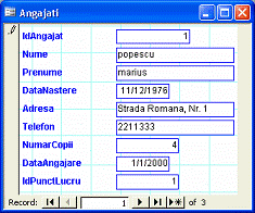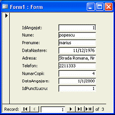 Formularul va afisa valorile ce se afla in campurile tabelei pentru inregistrarea curenta. Numarul acesteia ne este indicat in partea inferioara a ferestrei, alaturi de butoanele ce pot fi folosite pentru trecerea la o noua inregistrare. Butonul aflat in extrema dreapta poate fi utilizat pentru adaugarea unei noi inregistrari.