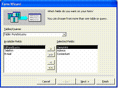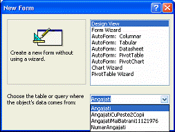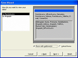 2. Form Wizard genereaza un formular pe baza campurilor selectate din unul sau mai multe tabele sau interogari;