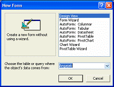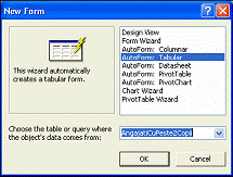Microsoft Access include un numar de noua programe Wizard prin intermediul carora se pot crea formulare in formate prestabilite, formulare tip grafic si formulare pivot; ele sunt activate la optiunea utilizatorului de a crea un nou formular, prin selectarea butonului New.