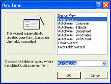 Pentru exemplificare vom construi un formular care sa permita consultarea tabelei PuncteLucru si actualizarea continutului acesteia – adaugare, modificare si stergere inregistrari. Selectam optiunea Form Wiyard si alegem tabela PuncteLucru ca sursa de date pentru formular.