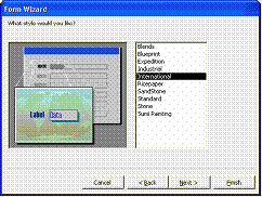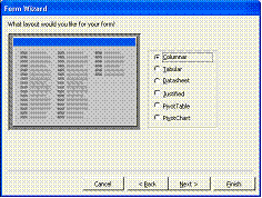 Urmeaza sa parcurgem o succesiune de pasi, la fiecare dintre acestia vom fi invitati sa specificam o serie de informatii iar pe baza acestora Microsoft Access va genera in mod automat formularul dorit. Trecerea la pasul urmator se realizeaza cu ajutorul butonului Next, revenirea la cel anterior se face prin folosirea butonului Back. Utilizand butonul Finish, utilizatorul poate opta pentru finalizarea procesului de creare automata a formularului chiar daca nu au fost parcursi totii pasii respectivi. Apasarea butonului Cancel atrage dupa sine inchiderea ferestrei fara generarea formularului.