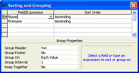 Pentru a realiza ordonarea, gruparea sau insumarea datelor va trebui sa folosim optiunea care se gaseste in meniul View si care apare si in cadrul meniului contextual declansat de apasarea butonului drept al mouse-ului. In fereastra ce apare ca urmare a accesarii optiunii respective vom putea specifica ordinea de sortare a informatiilor afisate in raport si eventualele criterii de grupare. Astfel, daca vom dori ca gruparea datelor sa se faca dupa campul Nume, iar ordonarea acestora in cadrul grupurilor sa se realizeze in ordinea alfabetica a prenumelui.