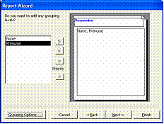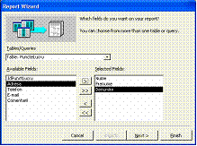 La primul pas va trebui sa indicam campurile care vor fi incluse in cadrul raportului. Putem alege orice tabel sau interogare din baza de date, iar campurile corespunzatoare vor fi afisate in lista aflata in partea stanga a ferestrei. Campurile alese vor fi mutate in partea dreapta. Folosind butoanele <, <<, >, >> putem selecta/deselecta campul curent sau toate campurile afisate. Pentru exemplu nostru vom alege cele trei campuri stabilite anterior, dupa care se apasa butonul Next..
