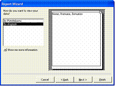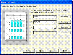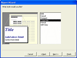 Crearea rapoartelor utilizand Report Wizard este o alternativa la crearea manuala a raportului. Aceasta optiune care ne va pune la dispozitie o serie de pasi la finalul carora raportul va fi generat in mod automat. Trecerea la pasul urmator se realizeaza cu ajutorul butonului Next, revenirea la cel anterior se face prin folosirea butonului Back. Utilizand butonul Finish, utilizatorul poate opta pentru finalizarea procesului de creare automata a raportului chiar daca nu au fost parcursi totii pasii respectivi. Apasarea butonului Cancel atrage dupa sine inchiderea ferestrei fara generarea raportului.