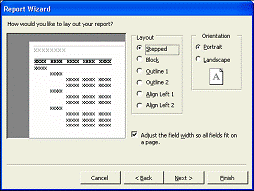 Dupa apasarea butonului Next suntem invitati sa alegem modul de dispunere a campurilor in interiorul formularului. Tot aici putem modifica orientarea paginii daca continutul raportului impune acest lucru.