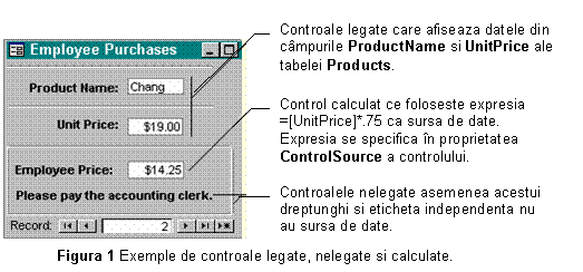 Controalele pot fi legate, nelegate sau calculate. Controlul legat este asociat unui câmp al tabelei sau interogarii de baza. Controalele legate sunt folosite pentru a afisa, edita si actualiza valorile câmpurilor din baza de date. Controlul calculat foloseste o expresie ca sursa de date. Expresia poate utiliza datele dintr-un câmp al tabelei sau interogarii de baza al formularului sau raportului. Controlul nelegat nu are sursa de date. Puteti folosi controalele nelegate pentru a afisa informatii, linii, dreptunghiuri si ilustratii. În figura 1 sunt prezentate exemple de controale legate, nelegate si calculate.
