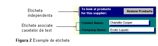 Etichetele sunt folosite pe un formular sau raport pentru a afisa text descriptiv cum ar fi: titlurile, semnificatiile sau scurte instructiuni (vezi figura 2). Etichetele nu afiseaza valorile din câmpuri sau expresii; ele sunt întotdeauna nelegate si ele nu se schimba în timp ce va deplasati de pe un articol pe altul.