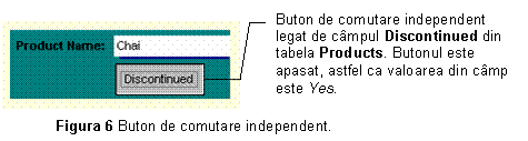 Puteti folosi un buton de comutare pe un formular ca un control independent pentru a afisa o valoare Yes/No dintr-o tabela, interogare sau instructiune SQL de baza. Spre exemplu, butonul de comutare din exemplu prezentat în figura 6 este legat de câmpul Discontinued din tabela Products. Tipul datei câmpului Discontinued este Yes/No. Atunci când butonul nu este apasat, valoarea din tabela Products este No.