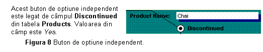 Puteti folosi un buton de optiune pe un formular sau raport drept control independent pentru a afisa o valoare Yes/No dintr-o tabela, interogare sau instructiune SQL de baza. Spre exemplu, butonul de optiune din exemplul prezentat în figura 8 este legat de câmpul Discontinued din tabela Products. Tipul de data a câmpului Discontinued este Yes/No. Daca butonul de optiune este selectat, atunci valoarea este Yes; daca nu, valoarea este No.