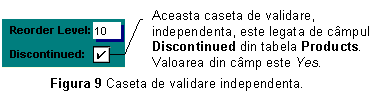Puteti folosi o caseta de validare pe un formular sau raport drept control independent pentru a afisa o valoare Yes/No dintr-o tabela, interogare sau instructiune SQL de baza. Spre exemplu, caseta de validare din exemplul prezentat în figura 9 este legata de câmpul Discontinued din tabela Products. Tipul de data a câmpului Discontinued este Yes/No. Daca caseta de validare contine simbolul de verificare, atunci valoarea este Yes; daca nu, valoarea este No.