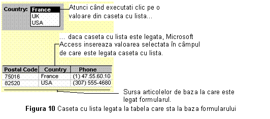 Atunci când utilizatorul selecteaza o valoare dintr-o caseta cu lista sau caseta combinata, aveti doua posibilitati: puteti stoca valoarea selectata într-o tabela (nu aceeasi cu cea din care ati obtinut lista) sau puteti transmite valoarea unui alt control. Spre exemplu, pentru caseta cu lista Supplier din figura 37, daca un utilizator selecteaza "Pavlova, Ltd.", atunci Microsoft Access cauta valoarea cheii primare (SupplierID) pentru Pavlova, Ltd. din tabela Suppliers si seteaza campul SupplierID (cheie externa) din tabela Products la aceeasi valoare. Aceasta este valoarea care se stocheaza. Deoarece memorati o valoare pe baza unei selectii din caseta cu lista, aceasta este legata (Retineti ca valoarea SuuplierName care provine din tabela Suppliers este afisata în lista dar nu este stocata).