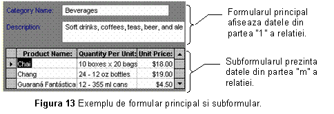 Subformularele sunt rficiente în special atunci când vreti sa prezentati datele din tabele sau interogari cu relatii 1 m (one-to-many). Spre exemplu, puteti crea un formular cu un subformular pentru a prezenta datele din tabelele Categories si Products. Datele din tabela Categories rerezinta partea "1" din relatie, iar datele din tabela Products reprezinta partea "m" din relatie - fiecare categorie poate avea mai mult de un singur produs (vezi figura 13).
