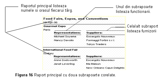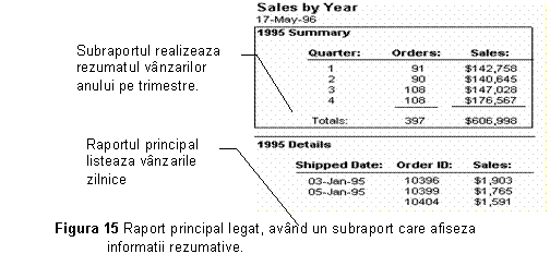 Legati raportul principal la o tabela, interogare sau instructiune SQL de baza atunci când doriti sa inserati subrapoarte ce contin informatii care sunt corelate cu datele din raportul principal. Spre exemplu, puteti folosi raportul principal pentru a afisa articolele detaliu, cum ar fi fircare vânzare dintr-un an, si apoi folositi un subraport pentru a prezenta infiramtiile rezumative, cum ar fi totalul vânzarilor din fiecare trimestru (vezi figura 15).