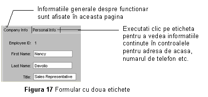 Puteti folosi un control Tab pentru a prezenta câteva pagini de informatii ca un singur set. Aceasta este utilza în special atunci când cu multe controale ce pot fi sortate în doua sau mai multe categorii. Spre exemplu, probabil ca veti dori sa folositi un control Tab pe formularuil Employees pentru a separa informatiile generale de cele personale (vezi figura 17).