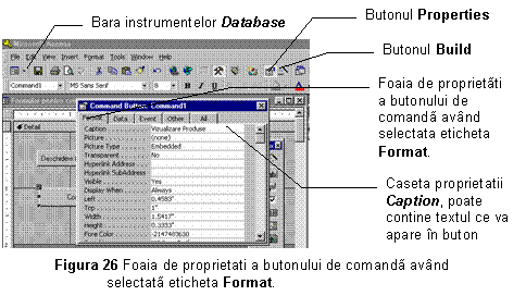 Daca doriti sa afisati text în butonul de comanda, selectati eticheta Format a foii de proprietati si în caseta proprietatii Caption tastati textul dorit (vezi figura 26). Daca nu doriti un text pe butonul de comanda, atunci puteti folosi o imagine.