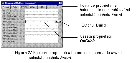 Se selecteaza eticheta Event (vezi figura 27) a foii de proprietati si în caseta proprietatii OnClick introduceti numele macro-ului sau procedurii eveniment care vreti sa fie executata atunci când se executa clic pe buton sau executati clic pe butonul Build din bara instrumentelor Database (vezi figura 25) sau din caseta proprietatii (vezi figura 27) pentru a folosi Macro Builder sau Code Builder.