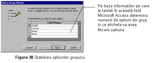 În prima caseta de dialog Option Group Wizard se va stabili care sunt optiunile grupului. În lista casetei cu dialog se tasteaza eticheta fiecarei optiuni din grup (vezi figura 30). Pe baza acestor date Microsoft Access determina si numarul de optiuni din grup. Executati clic pe Next pentru a continua..