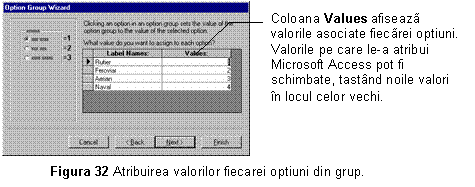 În a treia caseta Option Group Wizard se stabilesc valorile ce se vor atribui fiecarei optiuni. Microsoft Access va propune un set de valori (vezi figura 32), dar puteti sa le schimbati tastând noile valori în coloana Values. Executati clic pe Next pentru a continua.