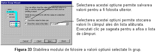 În a patra caseta de dialog Option Group Wizard se stabileste unde se memoreaza valoarea optiunii selectate. Valoarea optiunii selectate se poate memora într-un câmp (daca se alege optiunea Store the value in this field) sau ea poate fi folosita ulterior (daca se alege optiunea Save the value for later use) pentru executarea unei actiuni, cum ar fi tiparirea unui raport. Executati clic pe Next pentru a continua.