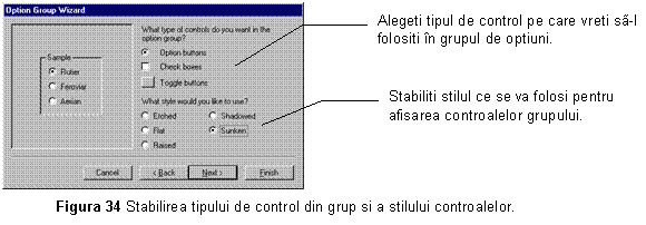 În a cincea caseta Option Group Wizard se stabileste tipul de control ce se va folosi în grupul de optiuni si stilul acestui control (vezi figura 34). Executati clic pe Next pentru a continua.