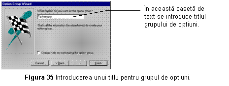 În ultima caseta Option Group Wizard se stabileste titlul grupului de optiuni (vezi figura 35). Executati clic pe Finish pentru a termina crearea grupului de optiuni.