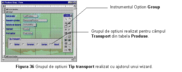 Dupa ce ati executat clic pe butonul Finish în ultima caseata de dialog Option Group Wizard, Microsoft Access 97 creaza grupul de optiuni (vezi figura 36) pe baza informatiilor furnizate.