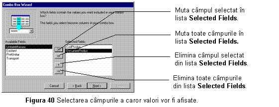 În a treia caseta de dialog Combo Box Wizard se aleg câmpurile care contin valorile ce vor fi afisate. În lista Available Fields se selecteaza un câmp si se excuta clic pe butonul > pentru a-l muta în lista Selected Fields (vezi figura 40). Executati clic pe butonul Next pentru a continua.