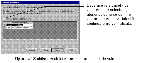În a patra caseta de dialog Combo Box Wizard se stabileste cum va arata lista si daca se afiseaza sau nu coloana care contine valoarea ce va fi folosita ulterior (vezi figura 41). În pasul anterior am selectat doua câmpuri, dar în aceasta caseta de dialog am stabilit ca se vor afisa numai valorile câmpului DenumireProdus. Totusi, daca în continuare se va folosi optiunea selectata de utilizator în lista pentru a executa alte operatii, atunci valoarea ce se va utiliza corespunde valorii din CodProdus (coloana din lista care nu este afisata). Lista din control poate afisa mai multe coloane, nu doar o singura coloana ca în acest exemplu. Executati clic pe butonul Next pentru a continua.