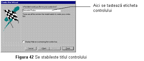 În a cincea caseta de dialog Combo Box Wizard se tasteaza numele controlului (vezi figura 42). Acestea sunt toate informatiile pe care trebuie sa le furnizati wizard-ului pentru a crea caseta cu lista sau caseta combinata.