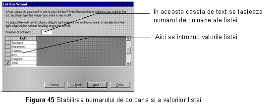 În a doua caseta de dialog List Box Wizard se stabileste câte coloane va avea lista si care sunt optiunile listei (vezi figura 45). Executati clic pe butonul Next pentru a continua.