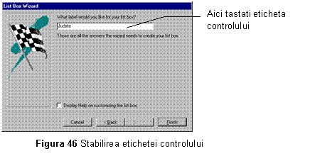 În ultima caseta de dialog List Box Wizard se precizeaza eticheta controlului. Pentru a termina operatia de creare a controlului executati clic pe butonul Finish.