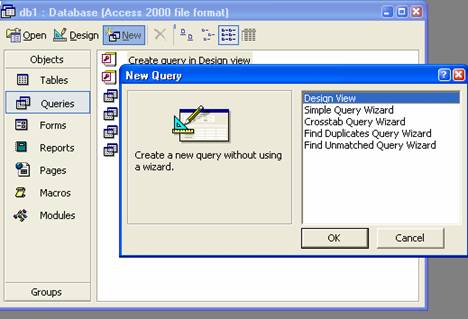 Pentru afisarea emisiunilor cu durata mai mica de 30 minute actionam fila Queries din fereastra Database , apoi butonul New. Īn continuare indicam unul din cele 5 moduri de creare a interogarilor, īn cazul nostru Design View (fig.14).