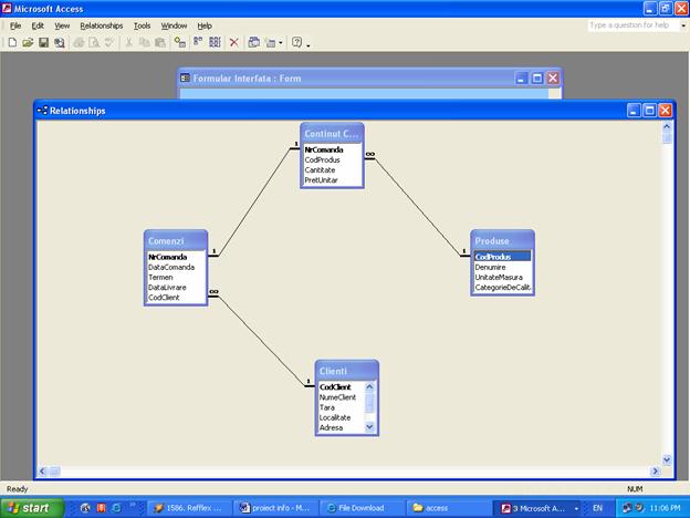 Dupa ce s-a selectat optiunea "QUERIES" din meniul "OBJECTS" cu ajutorul comenzii"Create with Design View" s-au realizat o serie de cereri utilizand obtiunea "SQL View"in prealabil fiind selectate tabelele dorite pentru realizarea cererilor.