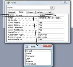 Crearea unui formular simplu:Forms-Create form in design view-clic dreapta pe formular-Properties-eticheta Data-Alegem optiunea Form-adaugam campurile dorite in formular prin drag&drop(tragerea cu mouse-ul pe suprafata formularului)-se realizeaza alte formatari optionale asupra formularului -salvare