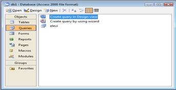 Pentru a defini o interogare de selectie selectam optiunea Queries din fereastra Database, apoi butonul Create query in design view.