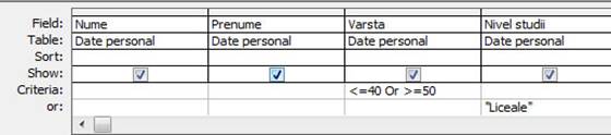 Operatorul Or este aplicat la nivel de camp (<=40 Or >=50) si intre campuri (conditiile puse asupra campurilor Varsta si Nivel studii sunt pe linii diferite).
