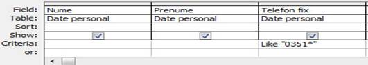 Odata adaugat un table in fereastra interogarii se vor alege campurile care se doresc a fi afisate si se stabilesc criteriile pe care trebuie sa le stabileasca datele(conditiile de selectie). Conditiile de selectie sunt expresii logice care vor fi verificate pentru ca articolele fisierelor sursa sa fie trecute in fisierul virtual rezultat al interogarii. Operatorii folositi sunt cei de comparare: < (mai mic),<= (mai mic sau egal),> (mai mare), >= (mai mare sau egal),<> (diferit), = (egal) si / sau cei logici: And (si logic) si Or (sau logic).