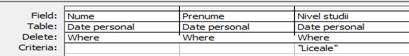 Operatorul And este aplicat la nivel de camp (>=30 And <=40) si intre campuri (conditiile puse asupra campurilor Varsta si Nivel studii sunt pe aceeasi linie).