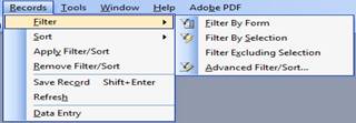 19. Filtre: adaugare, eliminare: filrele ne ajuta sa vizualizam doar acele date care indeplinesc o conditie aleasa de noi dar realizeaza nici un fel de modificare in structura tabelei. Pentru filtrarea datelor dintr-o tabela, interogare sau formular trebuie ca modul de vizualizare curent sa fie Datasheet View. Operatiile referitoare la filtrarea datelor se gasesc in meniul Records: