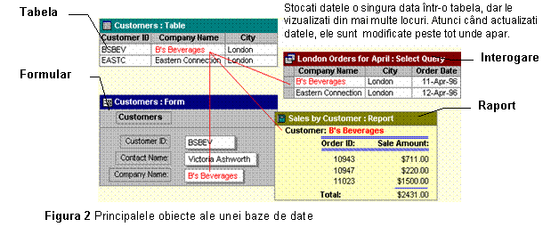 Folosind Microsoft Access puteti gestiona toate informatiile intr-un singur fisier baza de date. În interiorul fisierului, împartiti datele în containere separate de memorare numite tabele; vizualizati, adaugati si actualizati datele folosind formulare; cautati si regasiti numai datele dorite utilizând interogarile; analizati sau tipariti datele într-o anumita forma cu ajutorul rapoartelor (vezi figura 2).