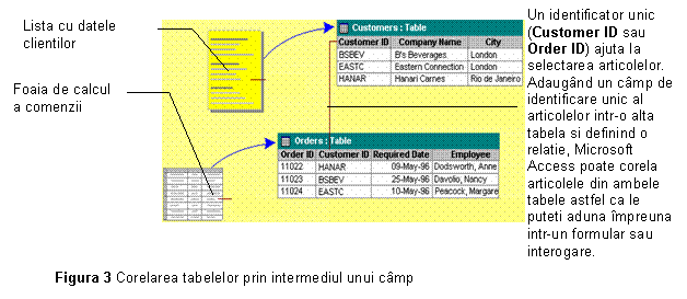 Pentru a memora datele, creati o tabela pentru fiecare tip de informatii pe care le urmariti. Pentru a strange impreuna datele din mai multe tabele intr-o interogare, formular sau raport definiti relatii intre tabele (vezi figura 3).