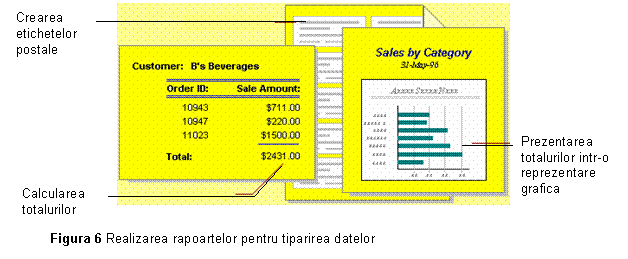 Pentru a analiza datele sau pentru a le tipari, creati un raport. Spre exemplu, puteti tipari un raport care sa grupeze datele si sa calculeze totaluri si un alt raport continând diferite date formatate pentru tiparirea etichetelor postale (vezi figura 6).