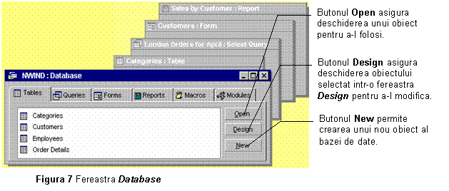 Pentru a lucra cu toate obiectele dintr-o baza de date Microsoft Access folositi fereastra Database (vezi figura 7). Executati clic pe o eticheta (spre exemplu, Tables) pentru a vizualiza o lista a tuturor obiectelor de acest tip existente. Folosind butoanele din dreapta listei puteti deschide sau modifica obiectele existente si puteti crea noi obiecte.
